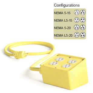 Factory assembled, pre-wired angled outlet box features a molded NEōTEX rubber housing and non-metallic coverplates as well as a rugged Super-Safeway plug and 12/3 SOW cable. They are also available with weather-resistant spring-loaded flip lid covers. The natural angle design of the box provides arc of bend relief for cords that are powered by this box. The primary plugs for pre-wired boxes match the configuration of the receptacles.